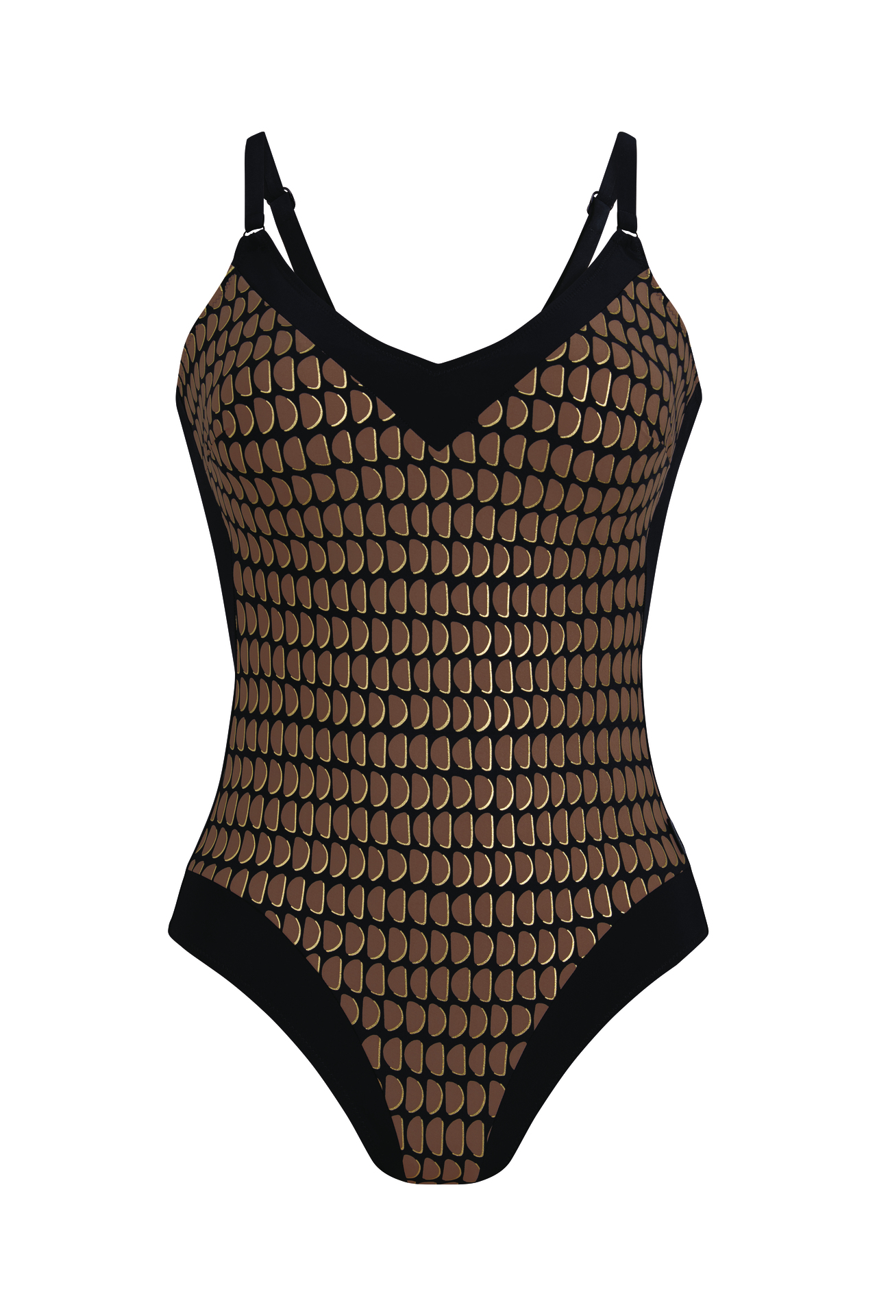 Une pièce avec une coque intérieure dissimulante. L’encolure en V est bordée d’un galon, et les découpes au niveau des jambes affinent la silhouette. Ce maillot de bain offre un look flatteur pour la silhouette.
